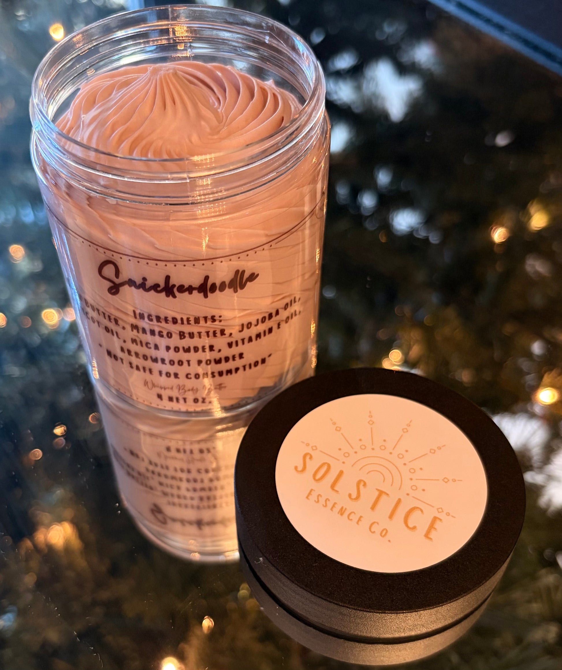 Shea Butter, Mango Butter, Jojoba Oil, Apricot Oil, Vitamin E Oil, Mica Powder, and Fragrance Oil